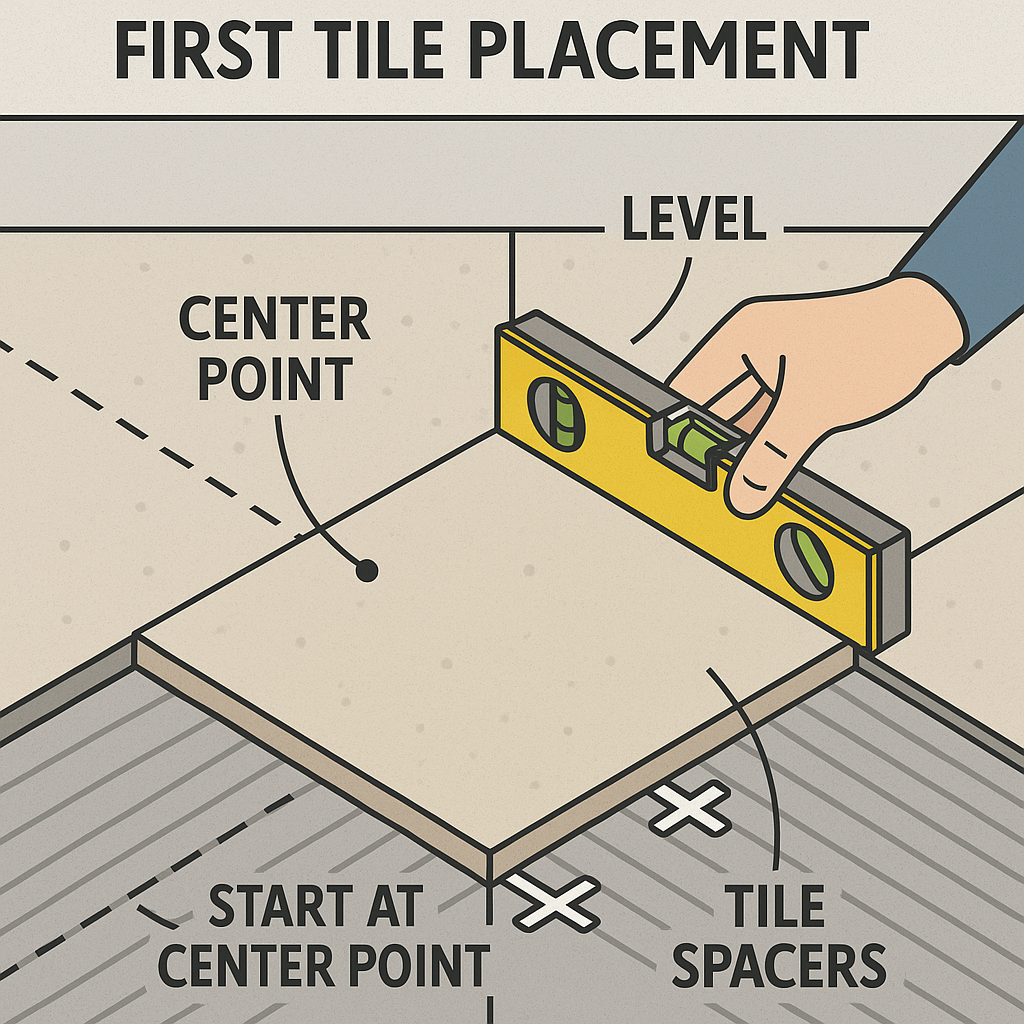 Using the chalk lines from your layout planning, start at the room’s center or your chosen focal point. This ensures tiles are evenly distributed across the space.