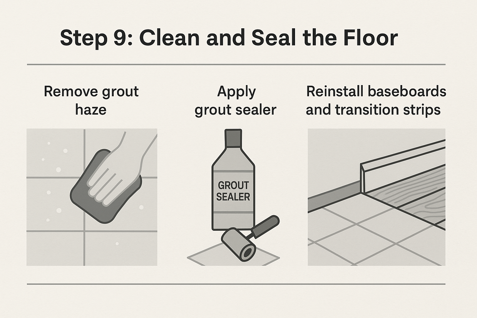 Once everything is clean and dry, reinstall your baseboards and add any necessary transition strips between different flooring types or rooms. This gives your new tile floor a polished, professional finish.